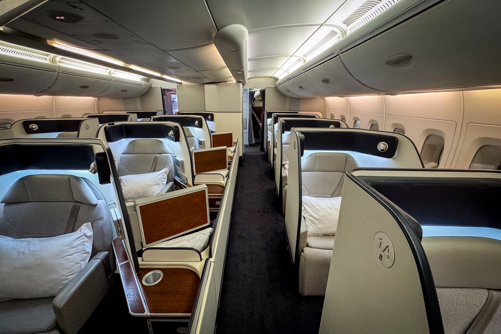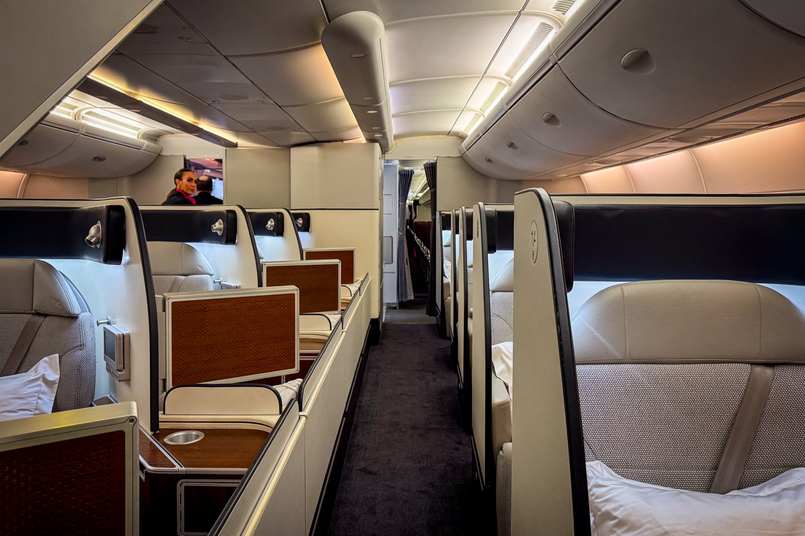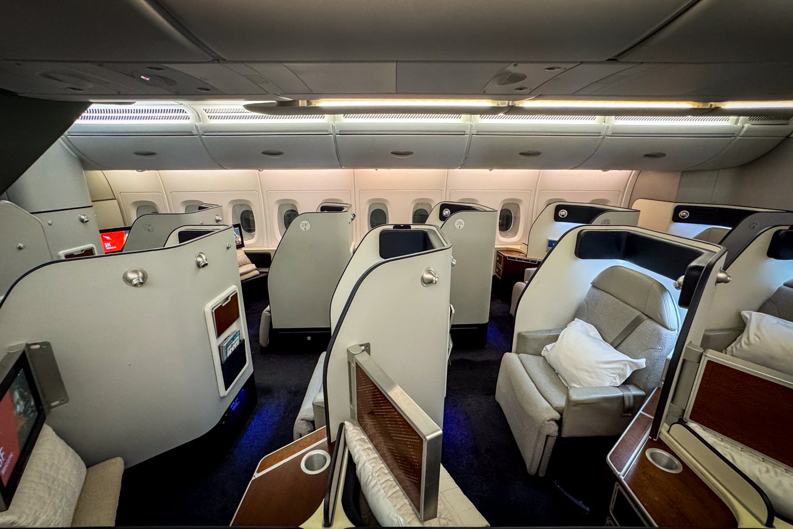 There are just 14 seats in Qantas’ first-class cabin, consisting of five single seats along each side of the cabin and four single seats running down the center.