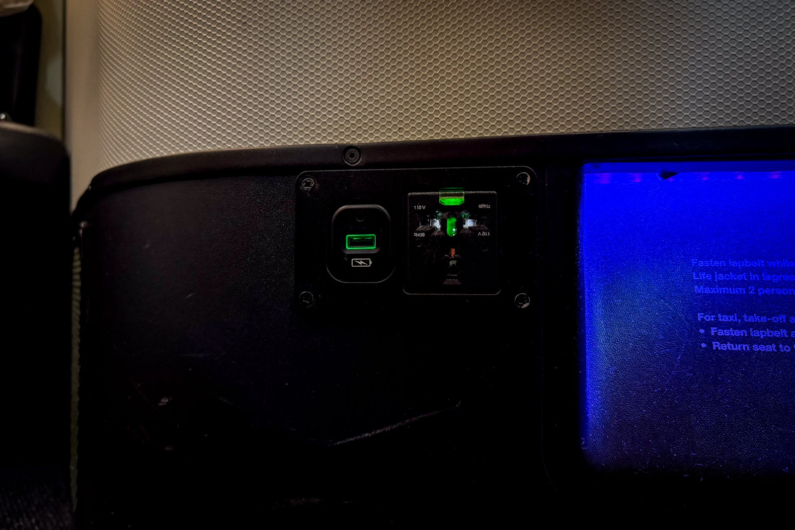 The seat has a universal power plug and a USB-A port under the seatback pocket and just next to the aisle, so be careful where you place those cords.