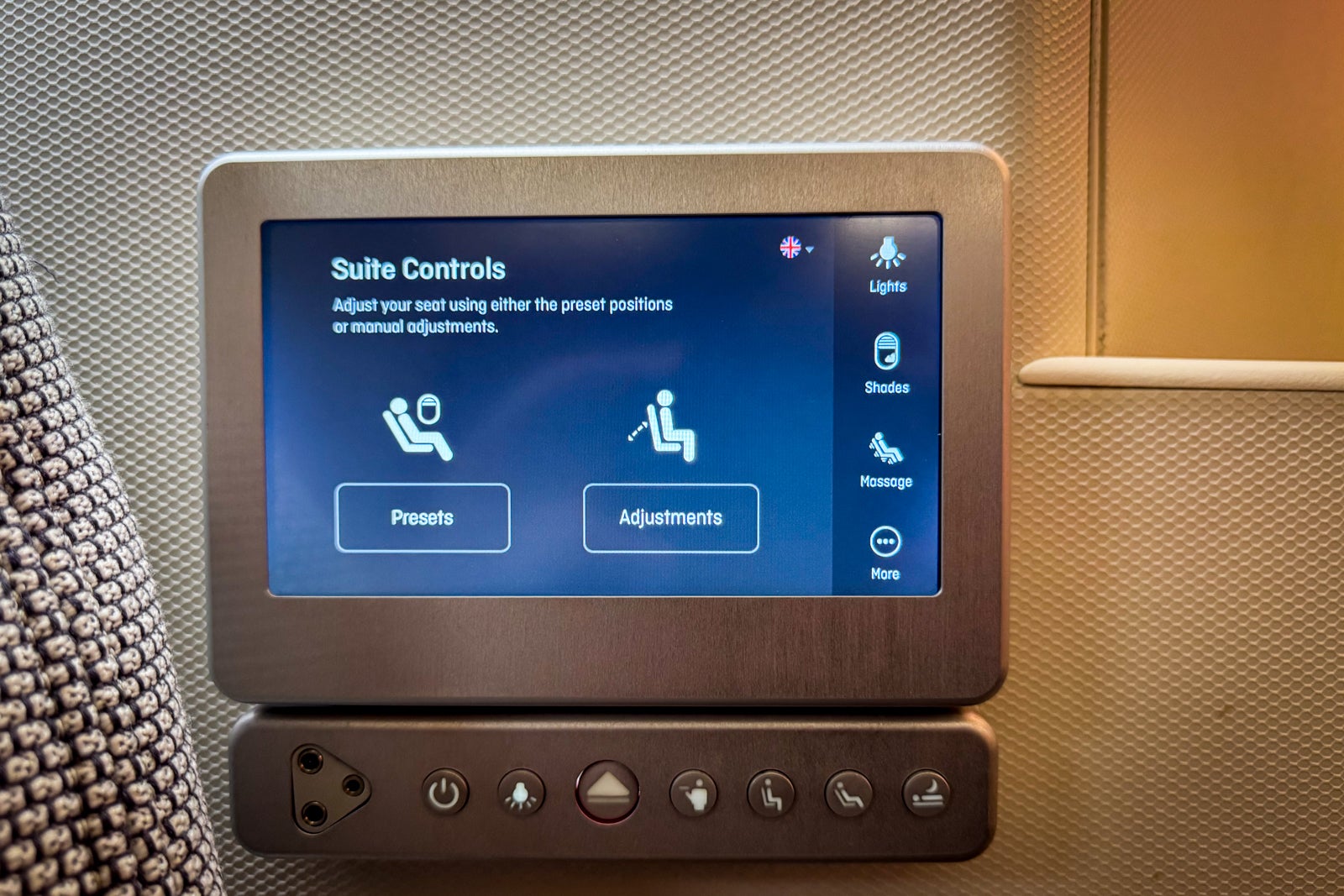 You can also use these buttons to maneuver the seat into six preset positions, move individual parts of the seat and adjust what turned out to be my favorite aspect of the seat, its gentle massage function. You can use the touchscreen to control the seat lighting, including ambient seatback fixtures, a reading light near the entertainment screen and overhead lights.