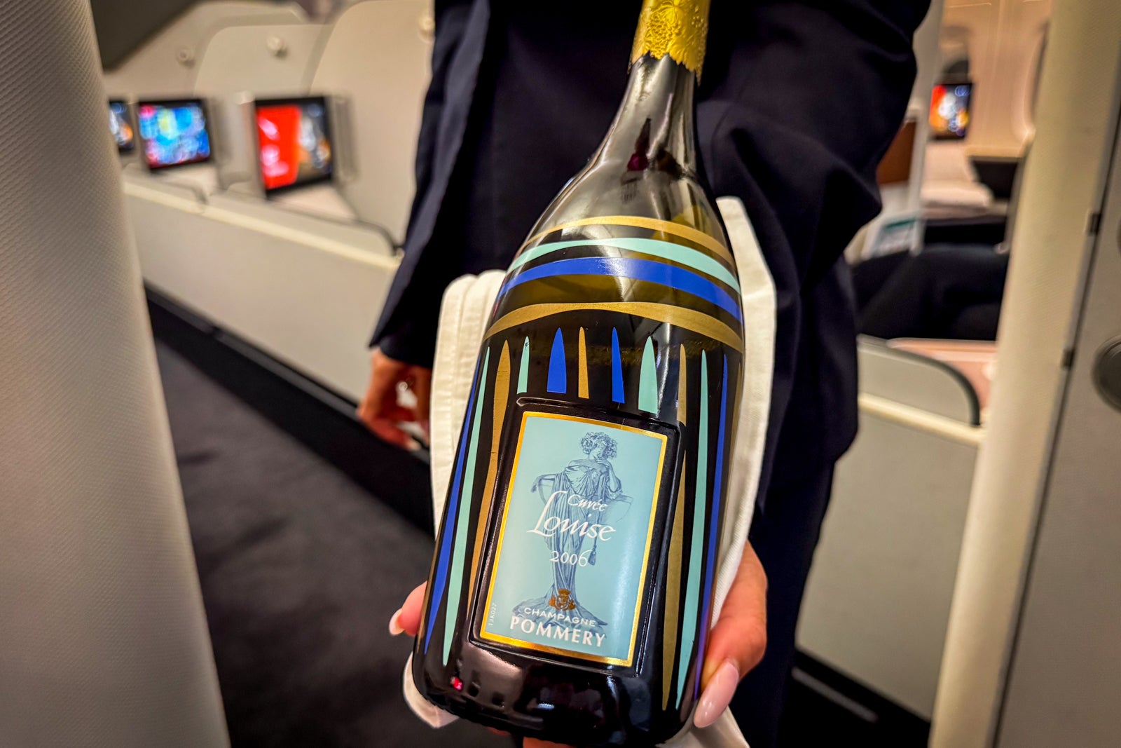 When I boarded, the cabin manager, Craig, showed me to my seat. While I settled in, the flight attendant taking care of my section, Diana, offered to explain all its functions. When she concluded, she asked if I would like a predeparture beverage, so I requested some water and Champagne.