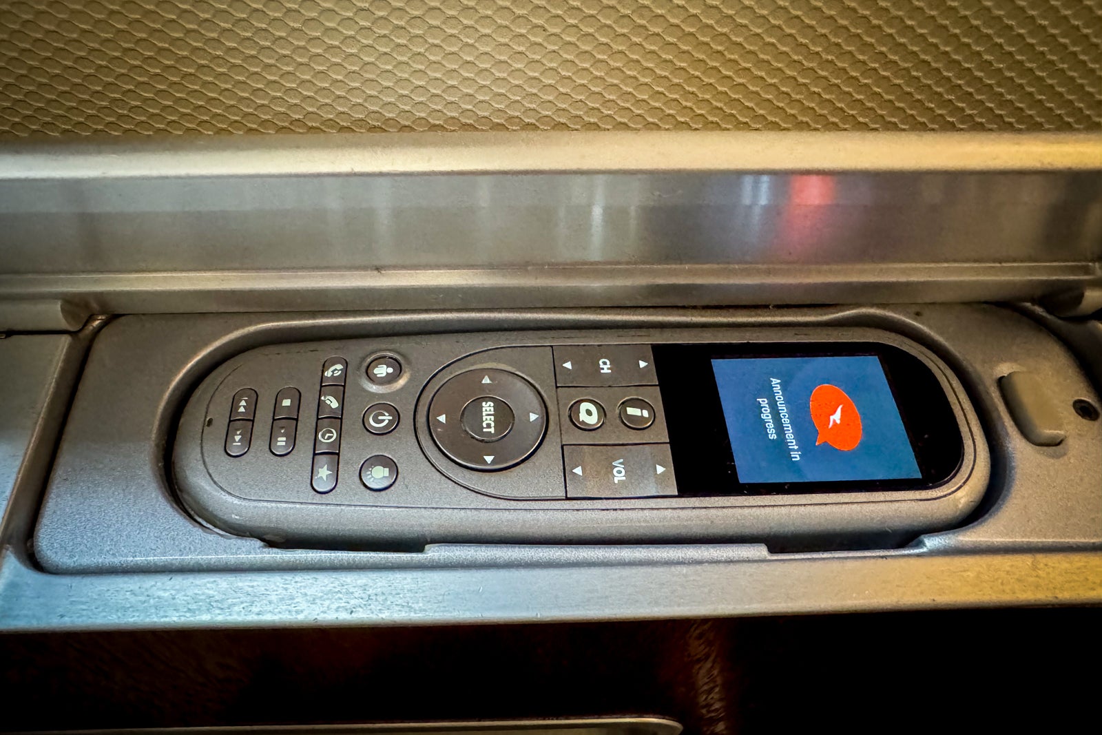 The armrest on the window side of the seat holds a wired remote control for the entertainment system, though I mostly used the monitor as a touchscreen.