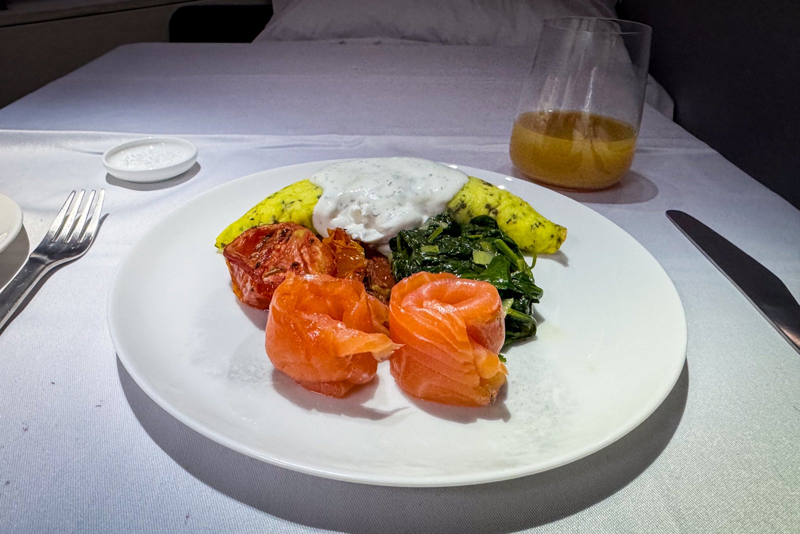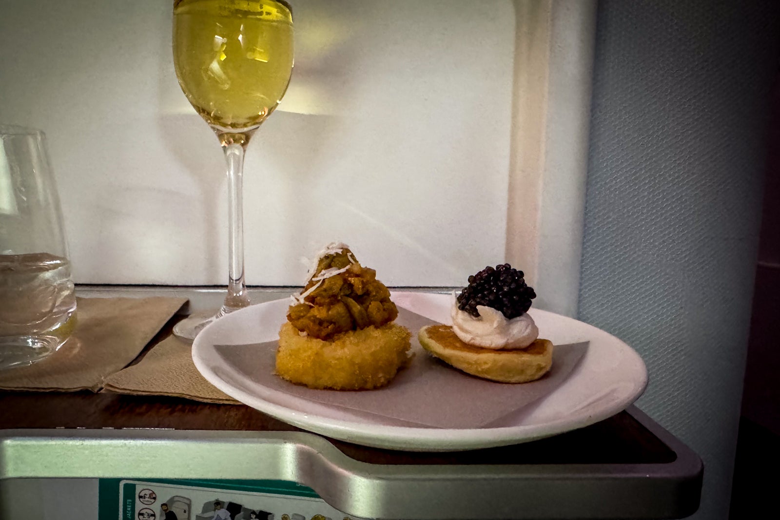 It started with another beverage served about 15 minutes after we hit cruising altitude. This time, I asked Diana for a glass of the other Champagne on board, Bollinger La Grande Annee 2015. It was a perfect inflight sip, if you ask me — crisp and elegant but with a little heft, which was nice for pairing with the two accompanying canapes, including one with caviar and Vermont creme fraiche and another with a tapioca croquette with ratatouille and pecorino cheese.