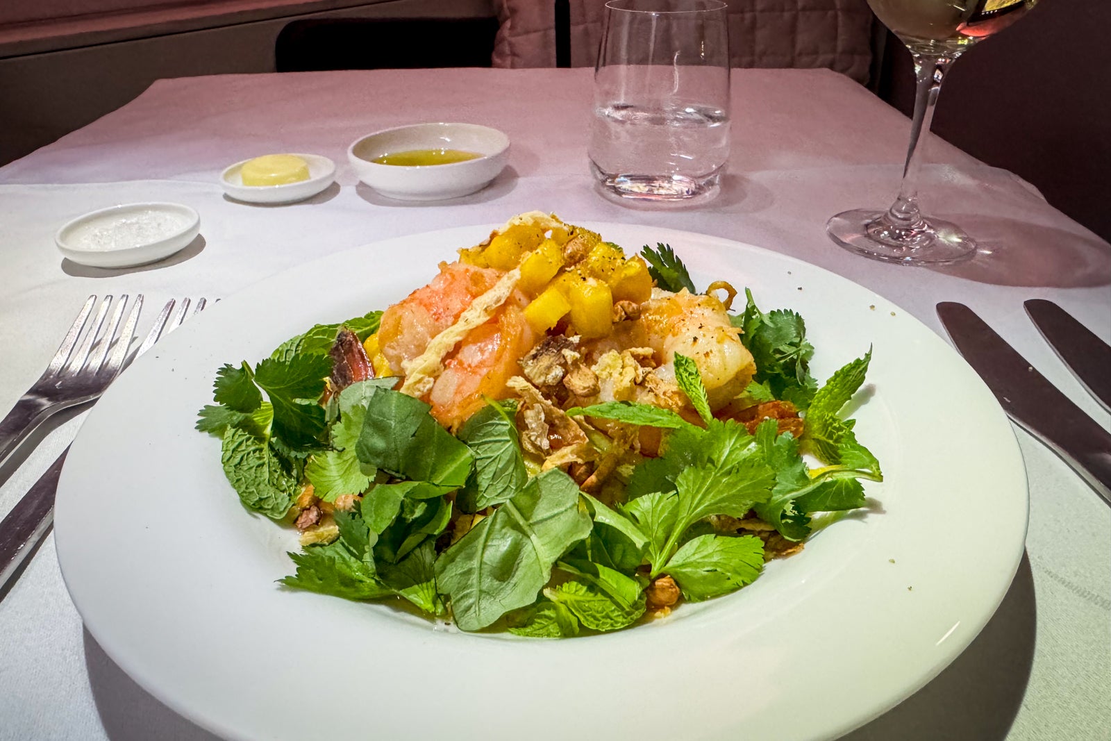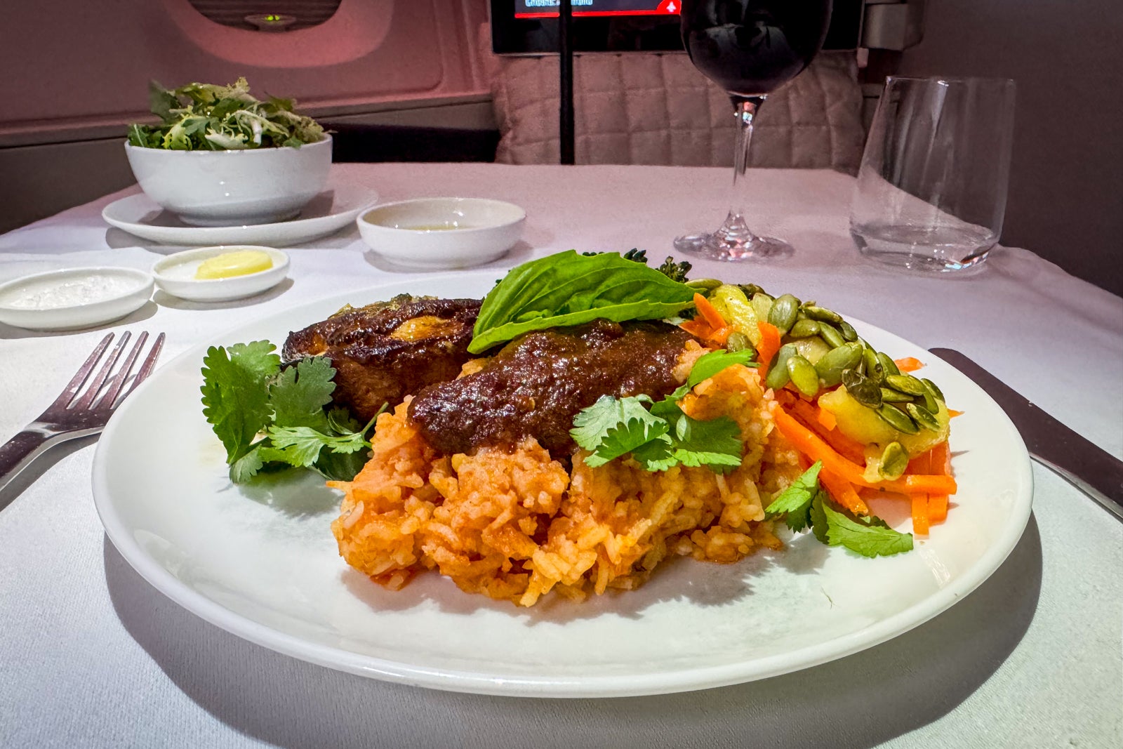 On my flight, we took off shortly after 11 p.m., and while some passengers opted to go right to sleep or to enjoy an expedited meal service, I settled in for the full dinner experience served on the airline’s signature Noritake bone china.
