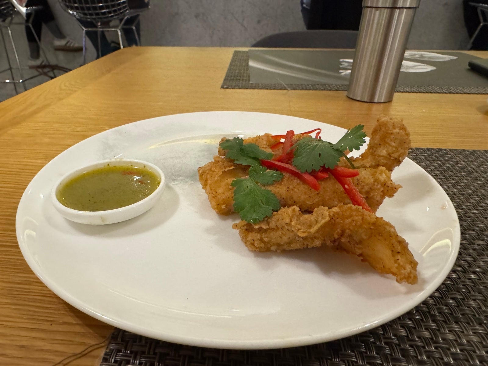 I’ll just note that the lounge was serving Lallier Reflexion R.021 Champagne at the time of my visit, and the seasonal a la carte menu included options like seared local sea bass with a fresh herb salad and spring asparagus with yogurt and chili. I ordered the famous salt and pepper squid, too, though, given it’s so highly regarded.